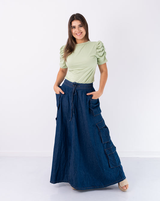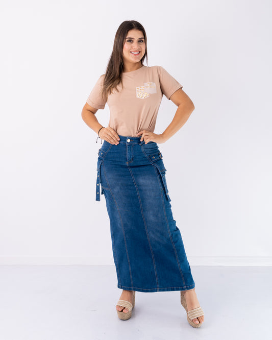 FALDA LARGA 3 BOLSILLOS CAMUFLADOS TELA CHAMBRAY