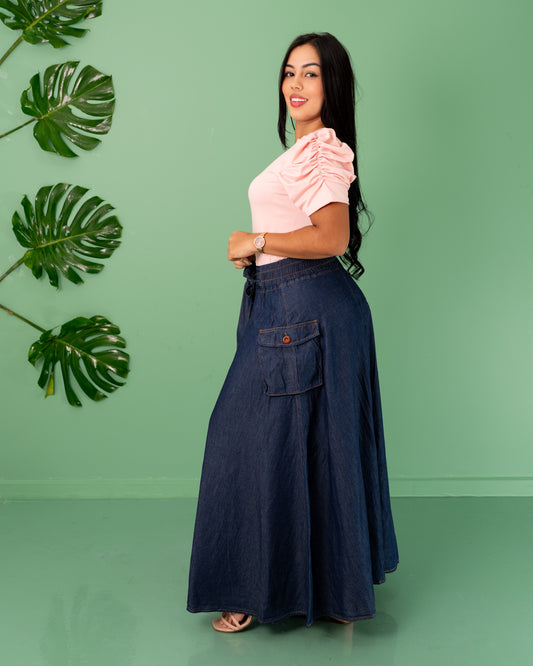 FALDA LARGA DE BOTONES Y BOLSILLO TELA CHAMBRAY