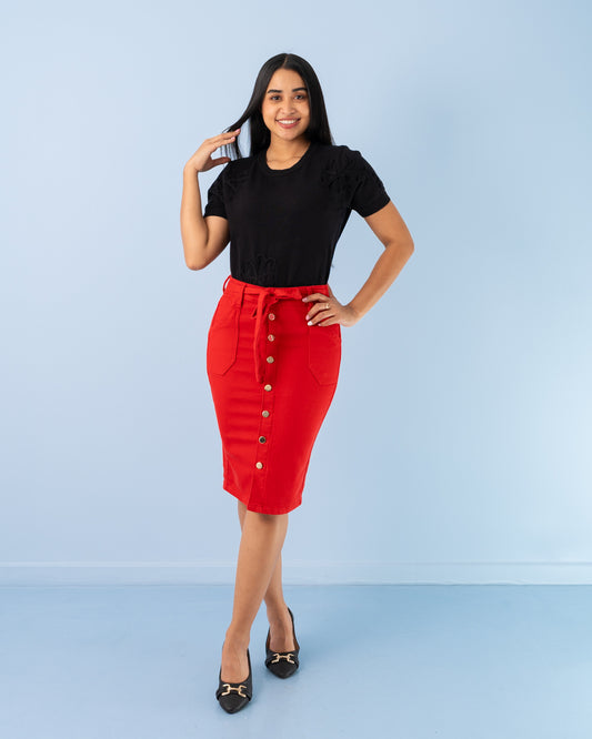 FALDA LARGA CAMPANA TELA BOTONES ADELANTE CON CINTURON