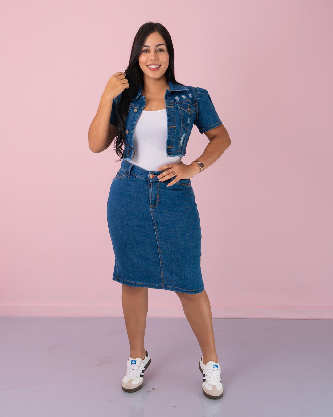 falda jean 3/4 mujer, falda denim clásica, falda lápiz mezclilla, ropa femenina versátil, falda jean cómoda casual, moda 2025 faldas.