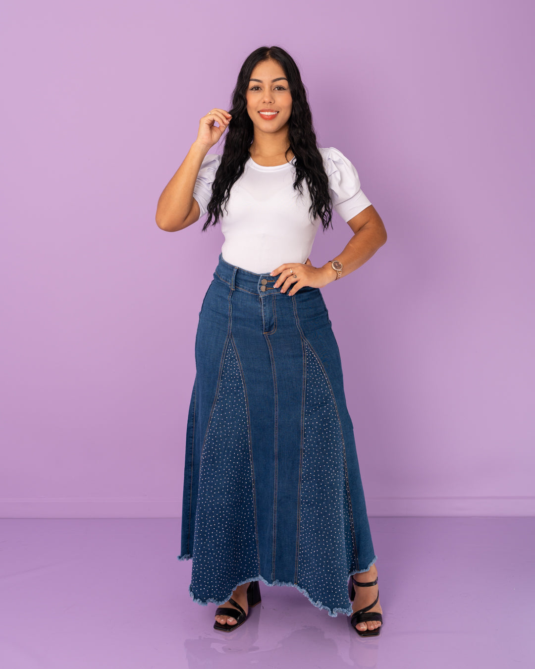 La falda jean larga nesgas con brillo es la combinación perfecta entre estilo sofisticado y diseño moderno. Confeccionada en denim stretch de alta calidad, se ajusta cómodamente a la cintura y caderas, mientras que su corte en nesgas aporta amplitud y movimiento elegante al caminar.