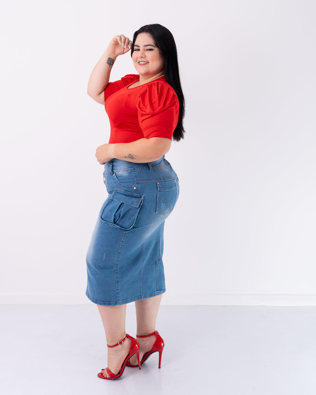 Falda jeans 3/4 para mujer plus, con bolsillos laterales camuflados y botones frontales decorativos. Diseño cómodo, moderno y perfecto para crear looks casuales y femeninos.