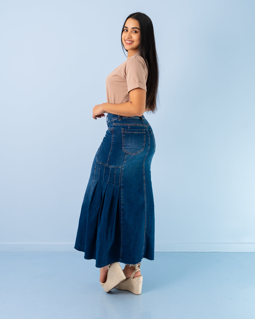 Falda jean larga con cortes laterales, diseñada para estilizar la silueta y brindar comodidad. Confeccionada en denim resistente y suave, ideal para looks casuales o elegantes. Una falda versátil y femenina perfecta para cualquier ocasión.