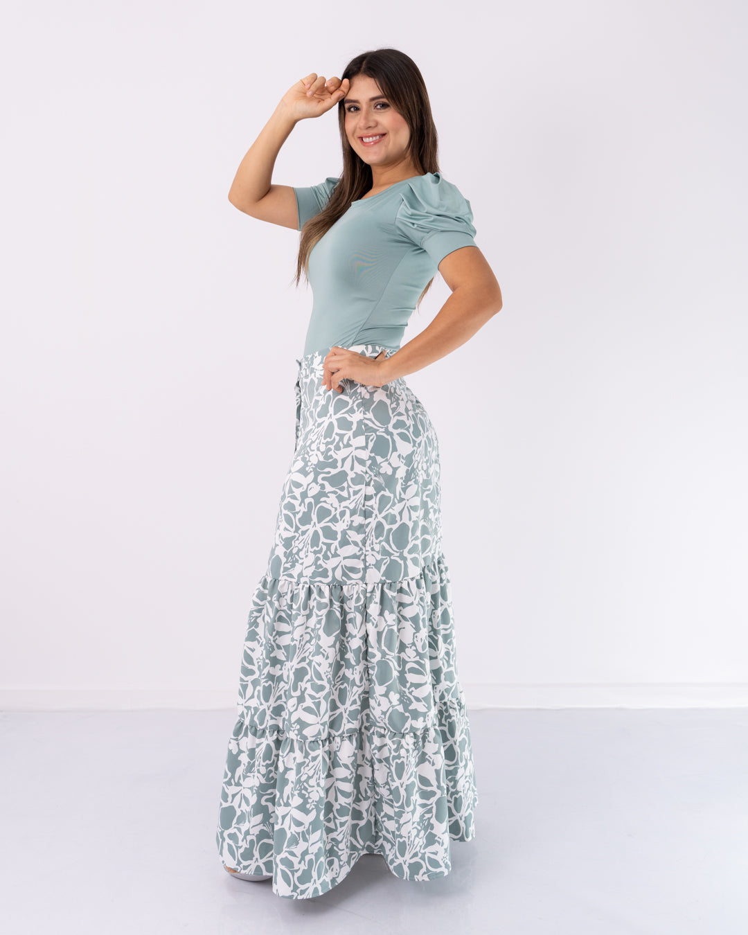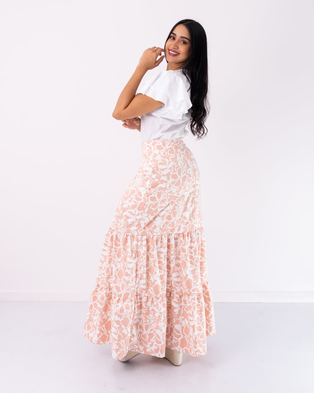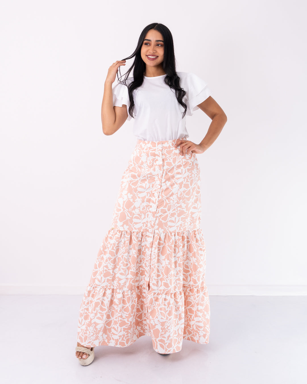Falda larga estampada con botones al frente, confeccionada en tela Mila con spandex para un ajuste cómodo y elegante. 🌸