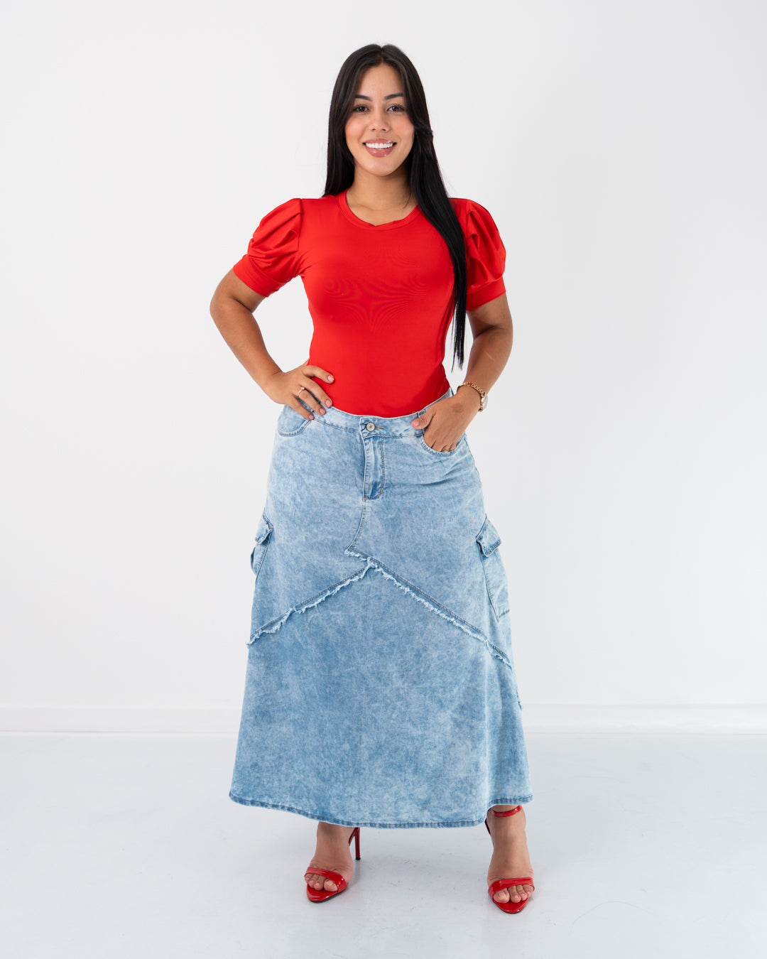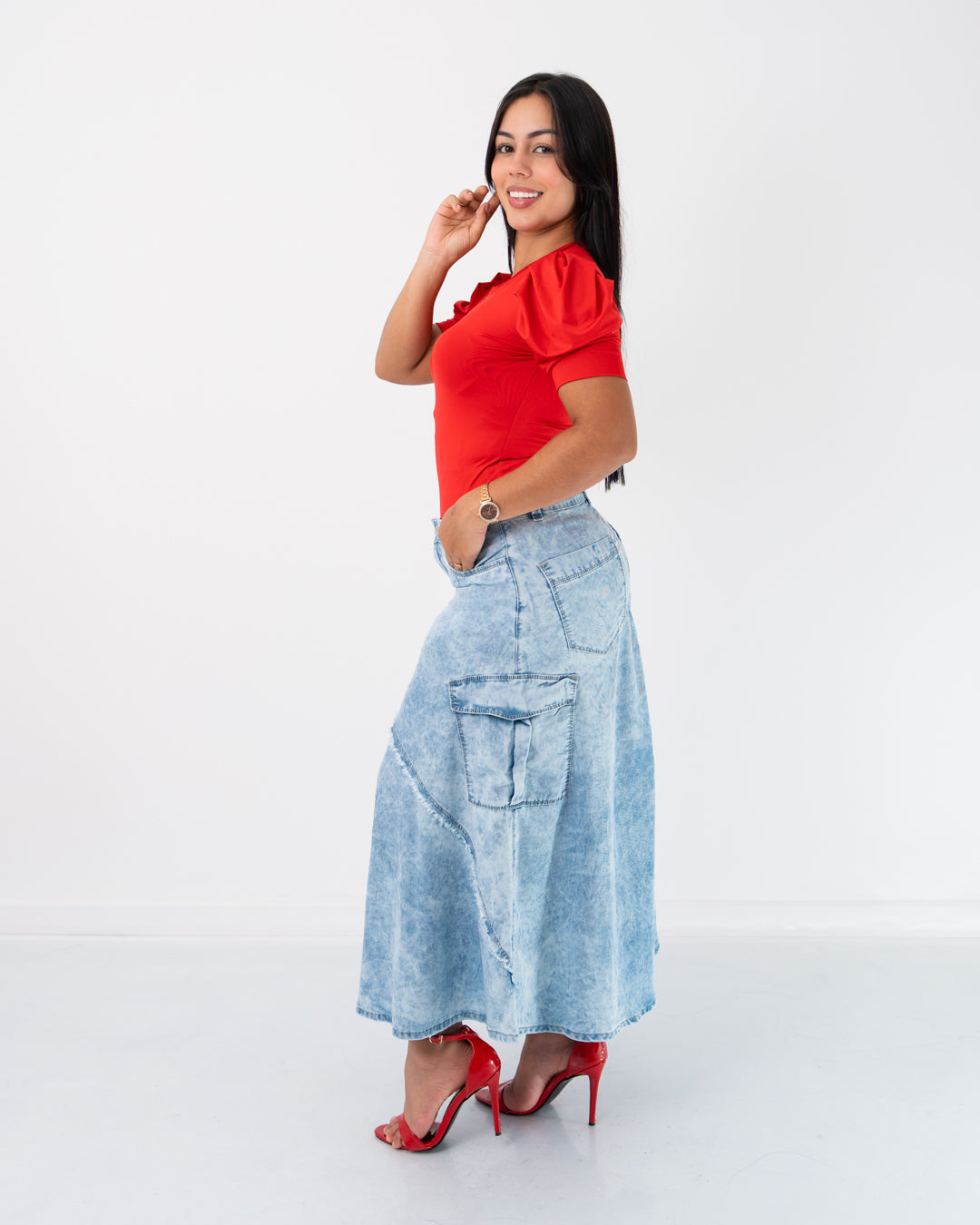 Falda larga tipo campana en tela chambray con bolsillos utilitarios estilo camuflado. Ideal para looks cómodos, modernos y modestos.