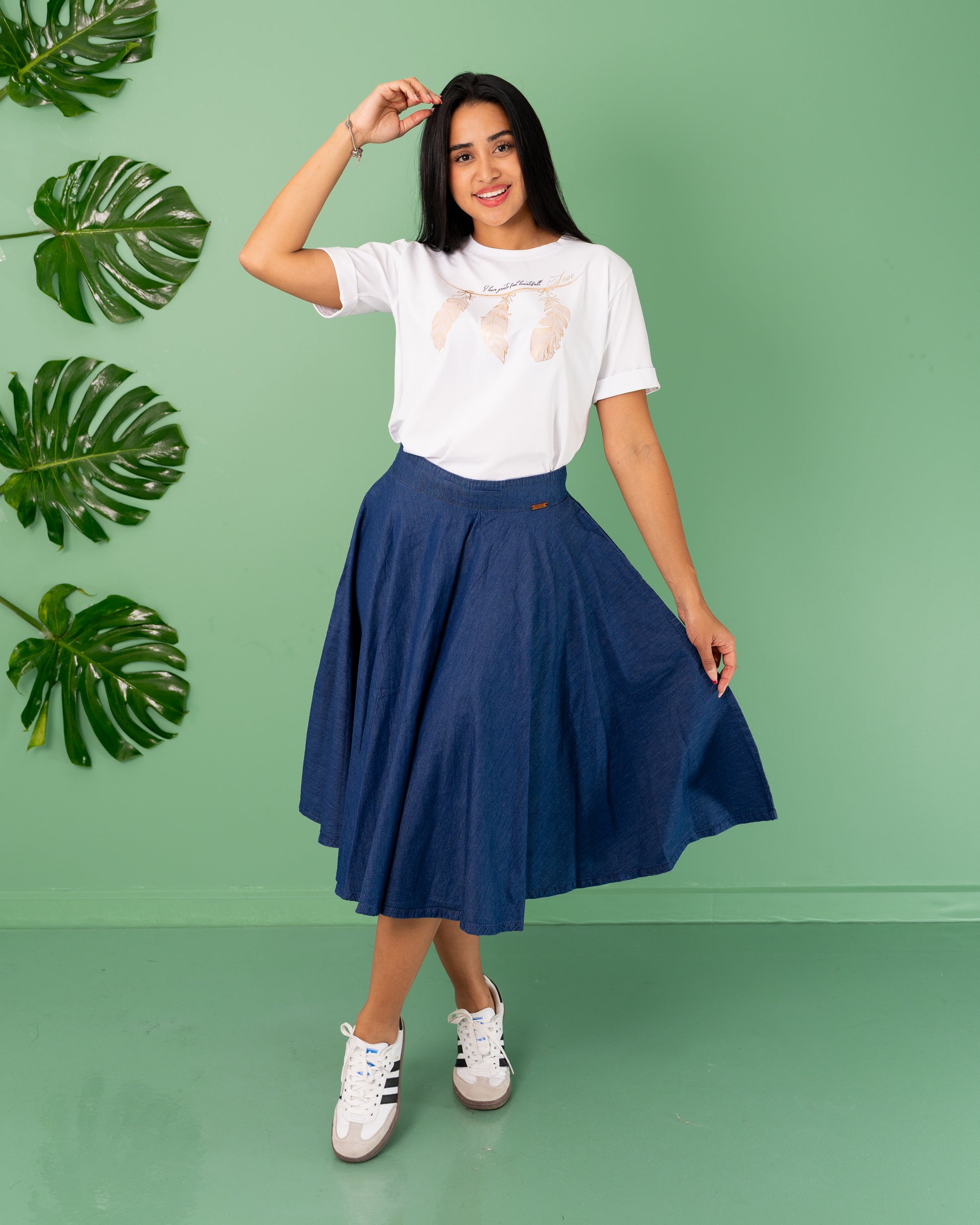 Falda Midi Amplia de Chambray – Movimiento, Frescura y Estilo