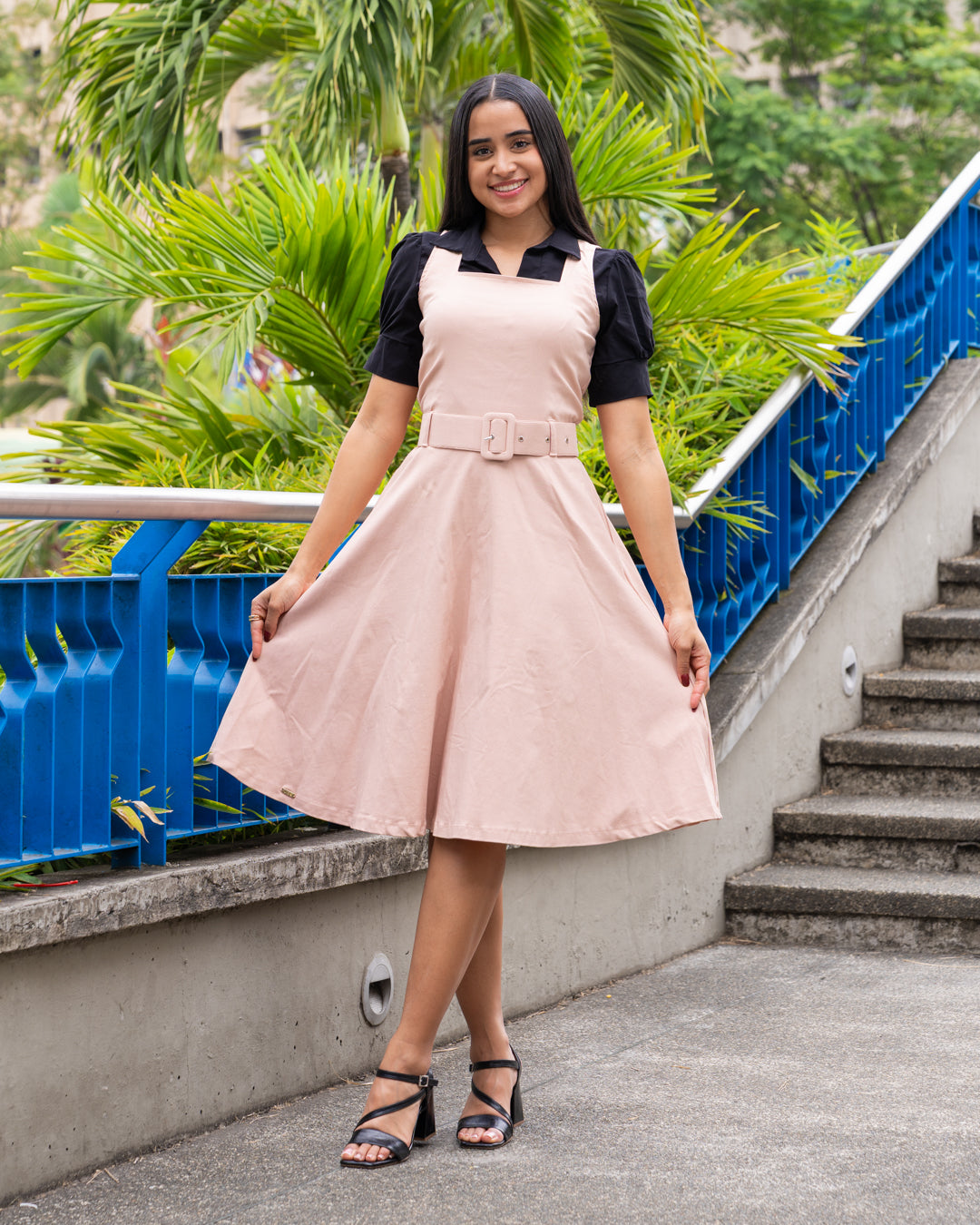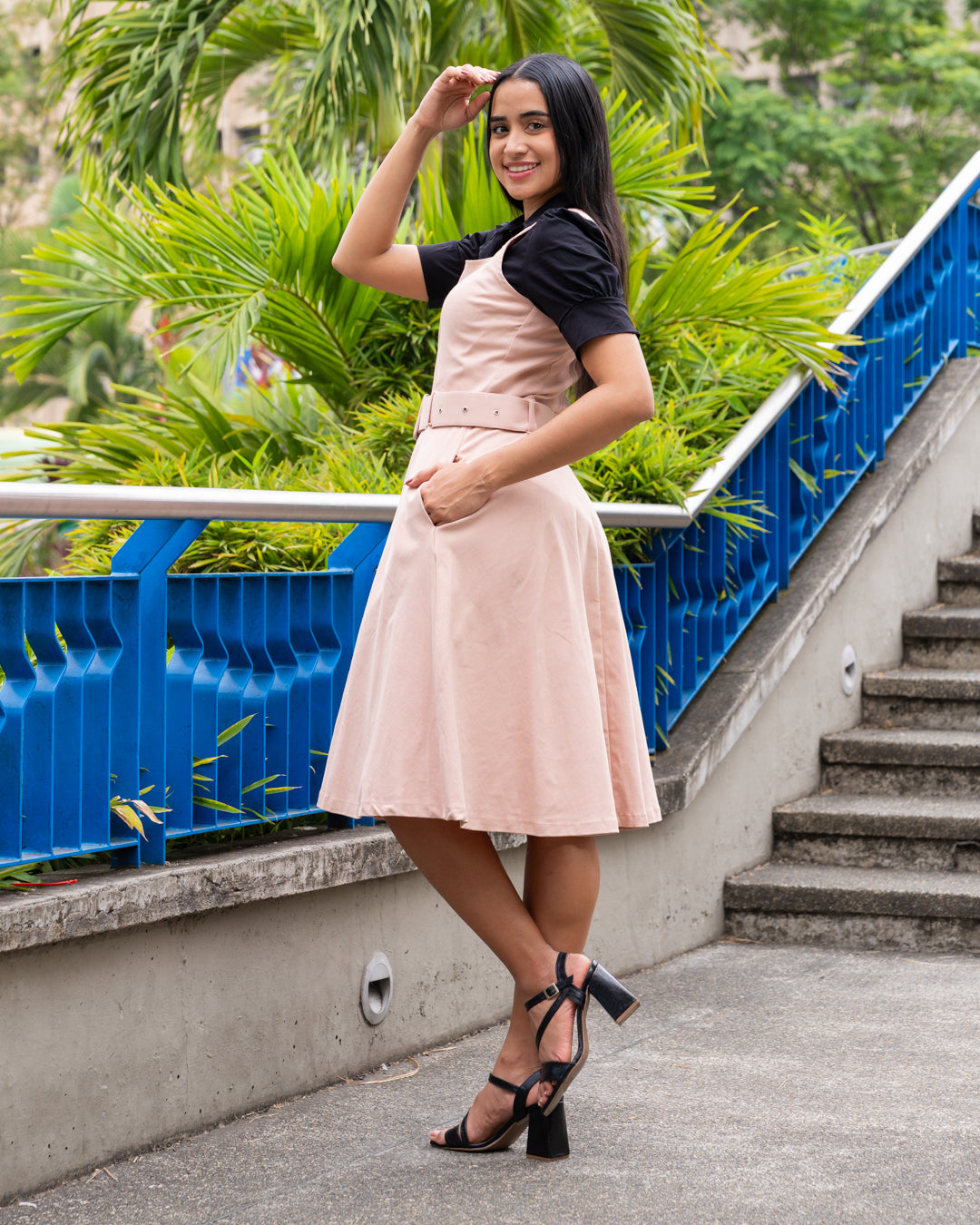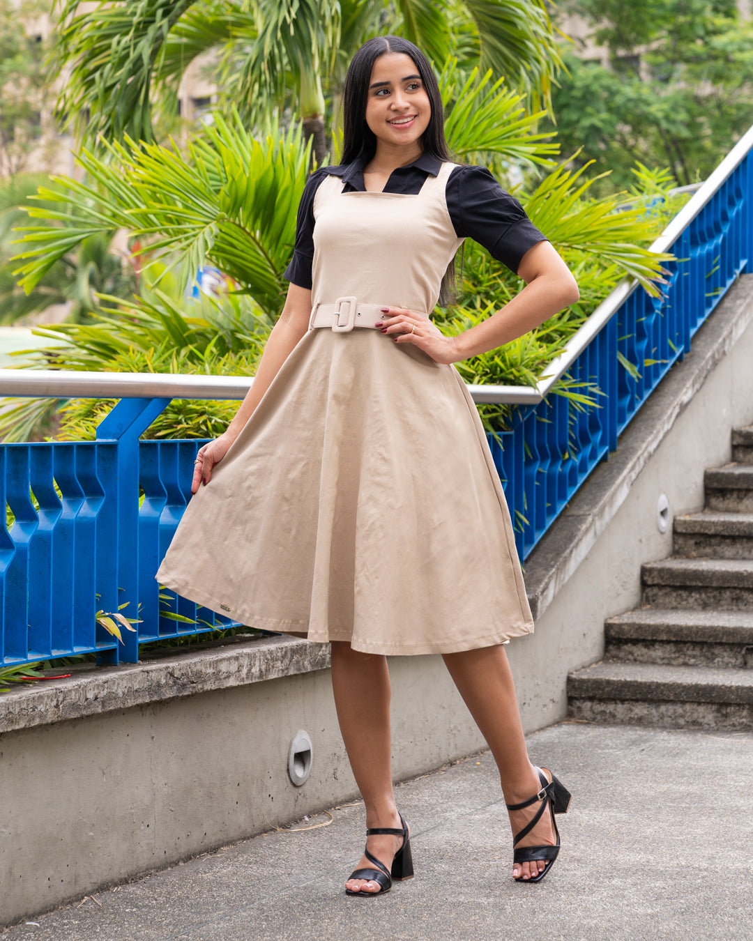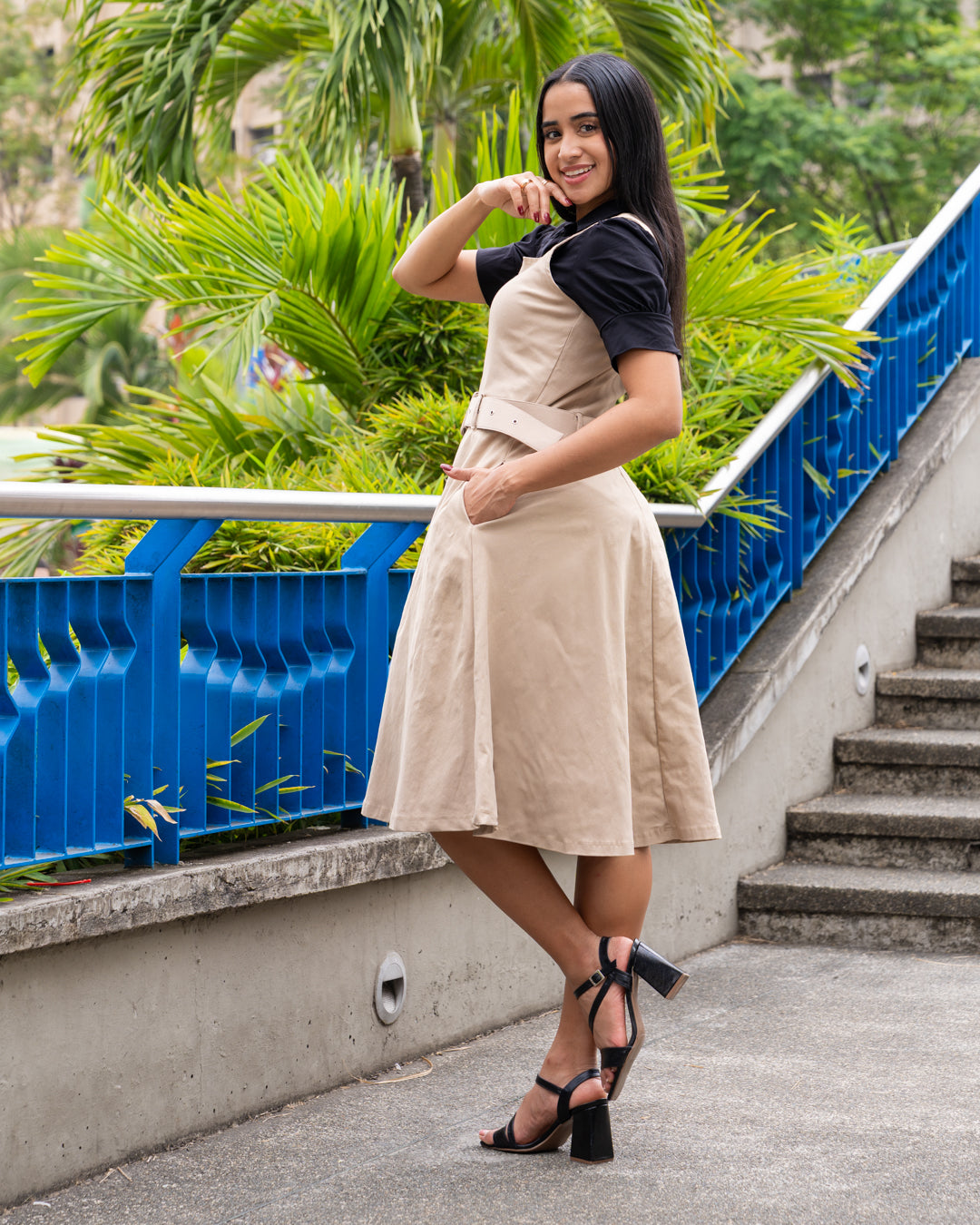 Esta jardinera estilo vestido es la combinación perfecta entre practicidad y estilo elegante. Con un corte rotondo que aporta movimiento y una silueta favorecedora, está confeccionada en tela suave tipo gabardina, ideal para lucir fresca y pulida durante todo el día. Incluye cinturón del mismo material que define la cintura y realza la figura.