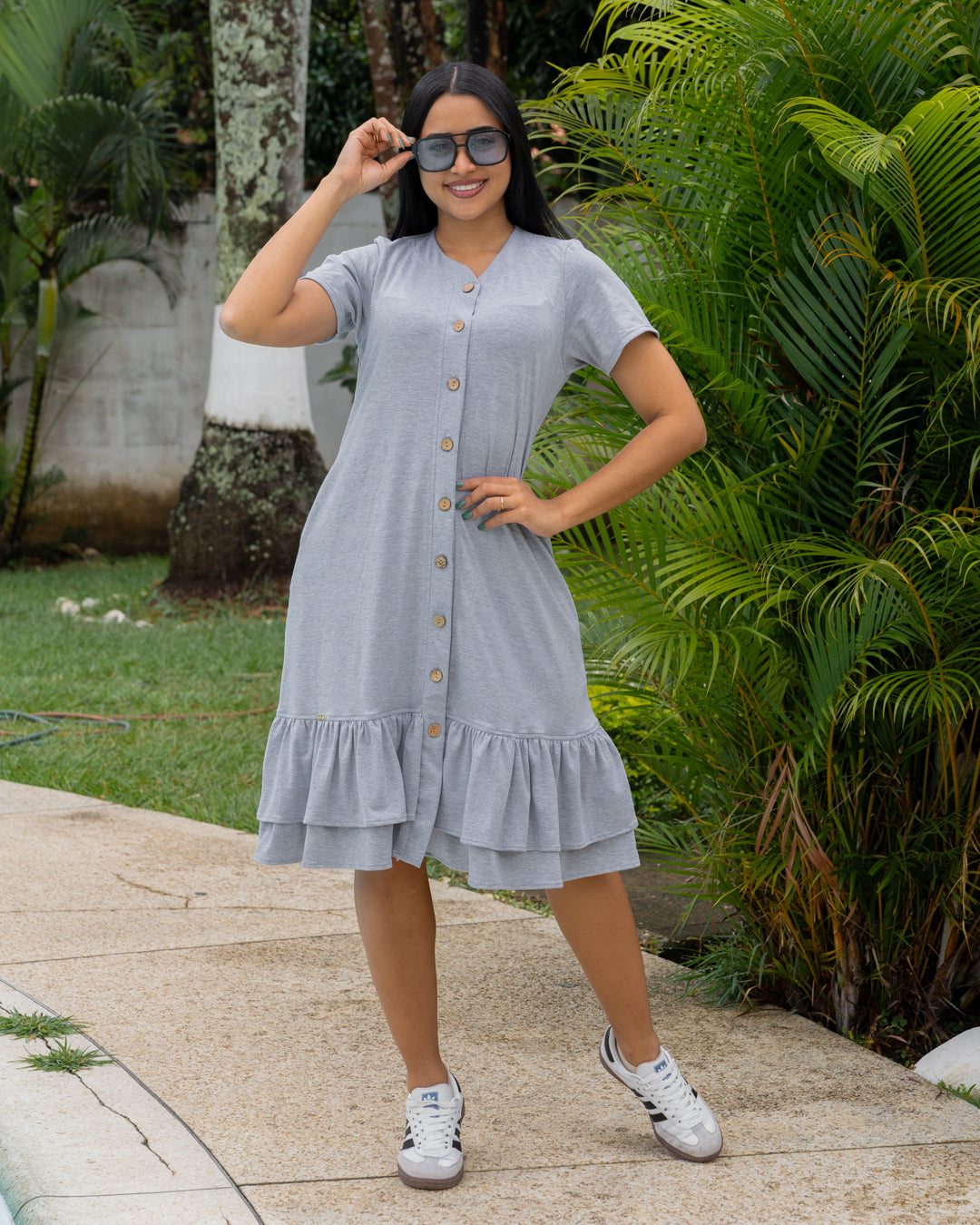 Descubre la comodidad y elegancia de nuestro vestido casual con botones y vuelo, una prenda diseñada para resaltar tu feminidad sin renunciar al confort. Su corte en A favorece todo tipo de figura, mientras que el doble vuelo inferior añade un toque romántico y moderno.