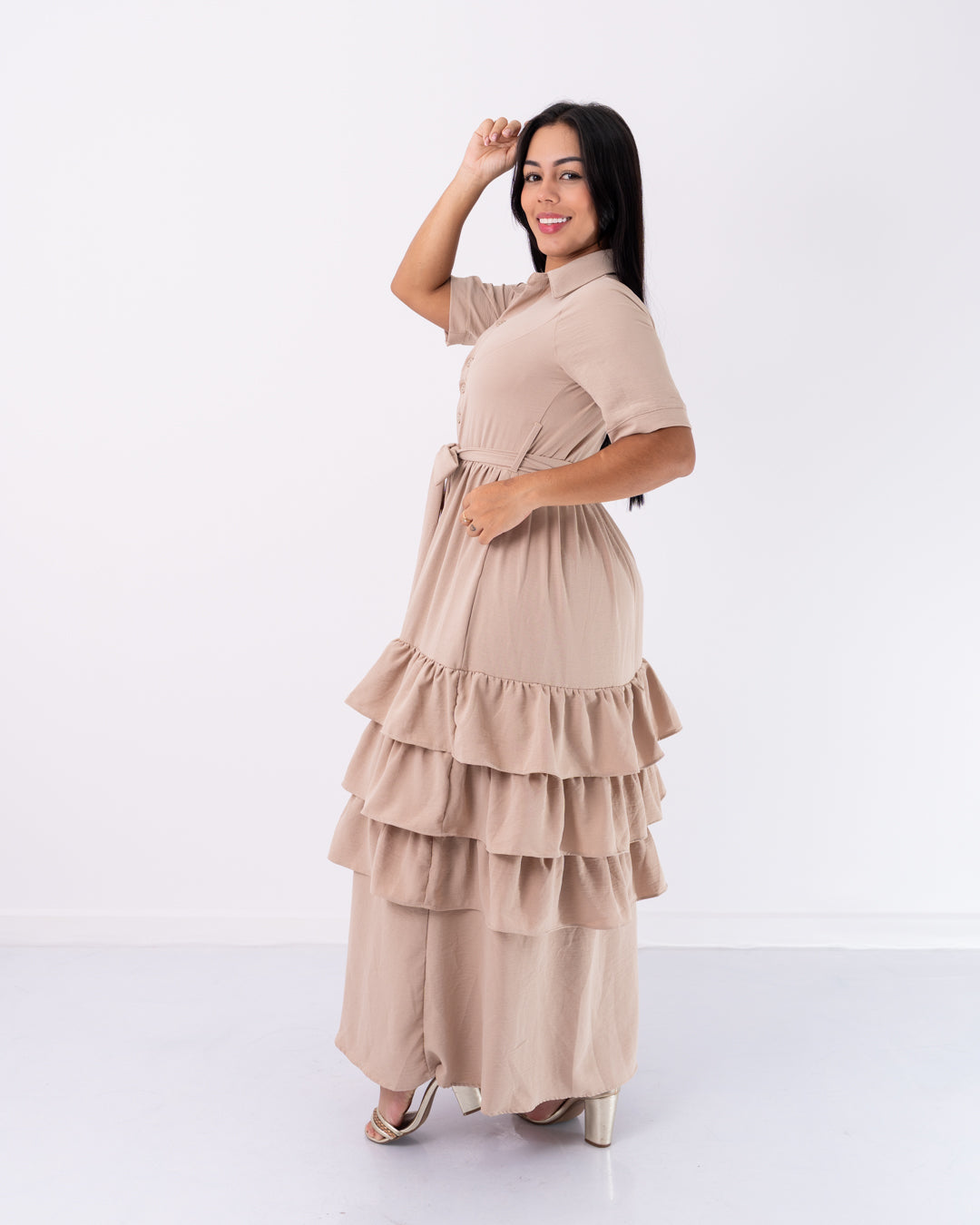 Vestido largo en tela crepé, con diseño de tres boleros en la falda, botones frontales y cinturón ajustable en la cintura. Fresco, cómodo y elegante, perfecto para lucir femenina y sofisticada en cualquier ocasión.